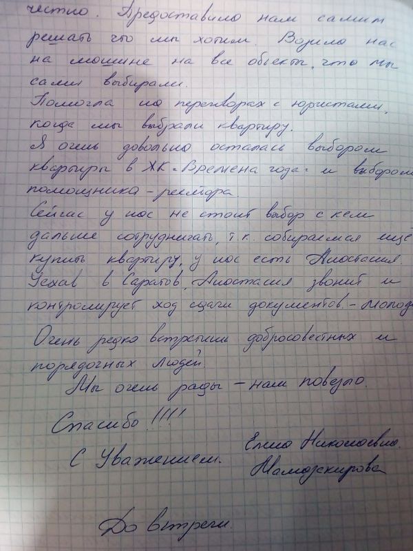 Сейчас у нас не стоит выбор с кем дальше сотрудничать, т.к. собираемся еще купить квартиру, у нас есть Анастасия. Уехав в Саратов, Анастасия звонит и контролирует ход сдачи документов – Молодец!