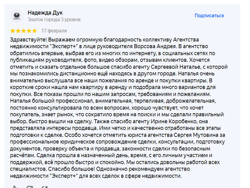 ЗаботаЗдравствуйте! Выражаем огромную благодарность коллективу Агентства недвижимости "Эксперт+" в лице руководителя Ворсова Андрея. В агентство обратились впервые, выбрав его из многих по интернету, в социальных сетях по публикациям руководителя, фото, видео обзорам, отзывам клиентов. Хочется отметить и сказать отдельное большое спасибо агенту Сергеевой Наталье, с которой мы познакомились дистанционно ещё находясь в другом городе. Наталья очень внимательно выслушала все наши пожелания по аренде и покупки квартиры. В короткие сроки нашла нам квартиру в аренду и подобрала много вариантов для покупки. Все показы прошли по нашим запросам, требованиям и пожеланиям. Наталья большой профессионал, внимательная, терпеливая, доброжелательная, постоянно консультировала по всем вопросам, хорошо чувствует, что хочет покупатель, знает рынок, что сократило время на поиски и мы сделали правильный выбор, быстро вышли на сделку. Также спасибо агенту Ирине Коробенко, она представляла интересы продавца. Ими четко и качественно отработаны все этапы подготовки к сделке. Особо хочется отметить юриста агентства Сергея Мутовина за профессиональное юридическое сопровождение сделки, консультации, подготовку документов, проверку объекта и продавца, законности сделки по безопасным расчётам. Сделка прошла в назначенный день, время, с его личным участием и поддержкой, всё прошло быстро и спокойно. Мы остались довольны работой всех специалистов. Спасибо большое! Однозначно рекомендуем агентство недвижимости "Эксперт+" для всех сделок в сфере недвижимости.