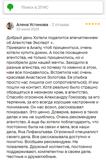 ЗаботаДобрый день. Хотели поделиться впечатлением об Агентстве Эксперт+. Приехали в Анапу, чтоб прицениться, очень хотели купить домик. А после посещения агентства не только приценились, но и приобрели дом нашей мечты. Заходили в разные агентства, но почему то именно в этом нам всё понравилось.