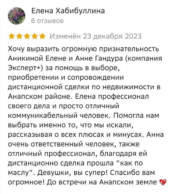 ЗаботаХочу выразить огромную признательность Аникиной Елене и Анне Гандура (компания Эксперт+) за помощь в выборе, приобретении и сопровождении дистанционной сделки по недвижимости в Анапском районе.