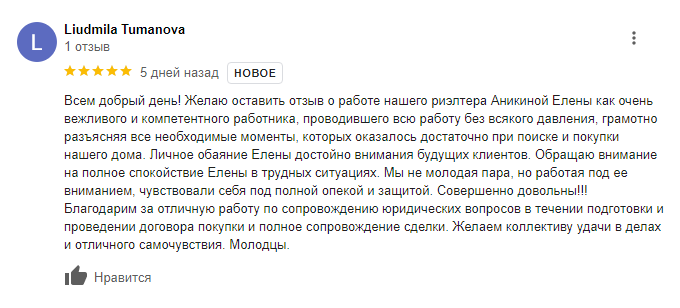 ЗаботаВсем добрый день! Желаю оставить отзыв о работе нашего риэлтера Аникиной Елены как очень вежливого и компетентного работника, проводившего всю работу без всякого давления, грамотно разъясняя все необходимые моменты, которых оказалось достаточно при поиске и покупки нашего дома.