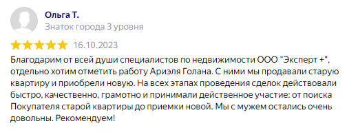 ЗаботаБлагодарим от всей души специалистов по недвижимости ООО "Эксперт +", отдельно хотим отметить работу Ариэля Голана. С ними мы продавали старую квартиру и приобрели новую.