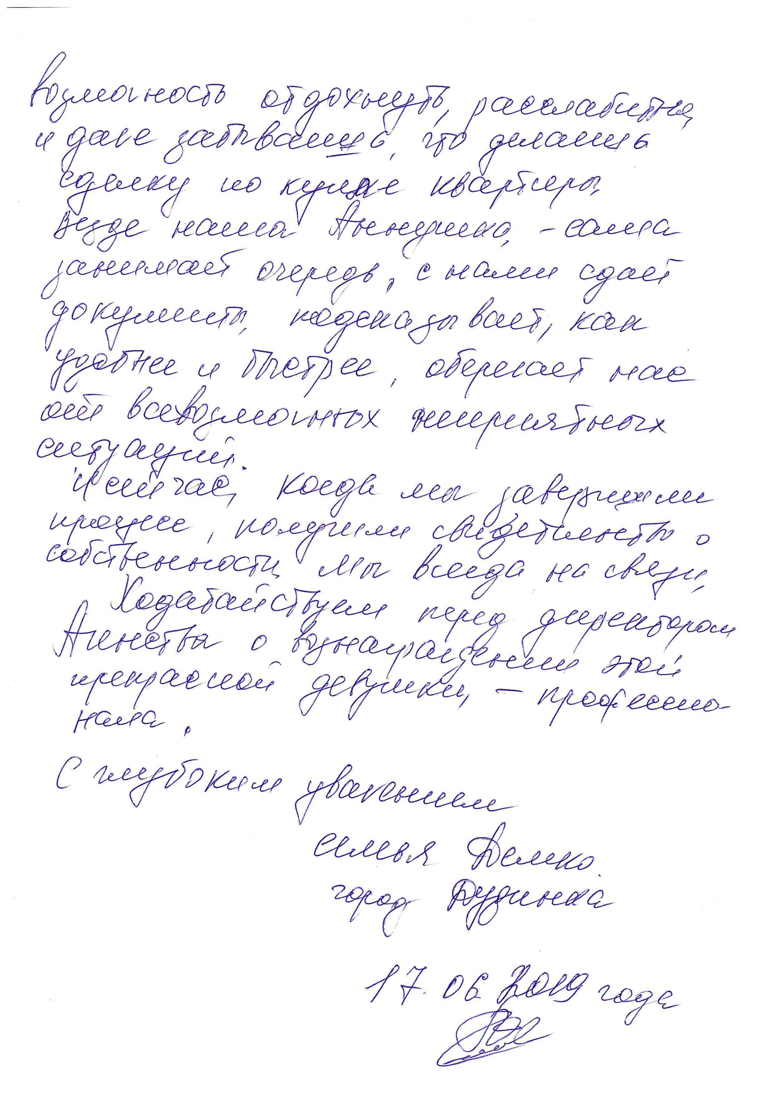 ЗаботаСемья Демко от всей души благодарит прекрасную девушку – Сентереву Аннушку, работника Агентства недвижимости.