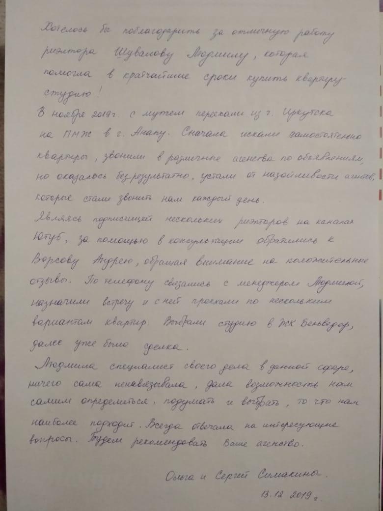 Людмила специалист своего дела в данной сфере, ничего сама не навязывала, дала возможность нам самим определиться, подумать и выбрать, то что нам наиболее подходит. Всегда отвечала на интересующие вопросы. Будем рекомендовать Ваше агентство.