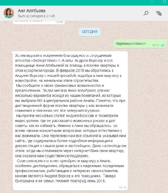 Советуем всем кто хочет приобрести квартиру в Анапе, особенно дистанционно, обращаться к надежным, порядочным, профессионалам, работающим в интересах своих клиентов, какими являются Андрей Ворсов и его помощники.