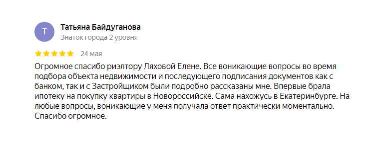 ЗаботаОгромное спасибо риэлтору Ляховой Елене. Все возникающие вопросы во время подбора объекта недвижимости и последующего подписания документов как с банком, так и с Застройщиком были подробно рассказаны мне.