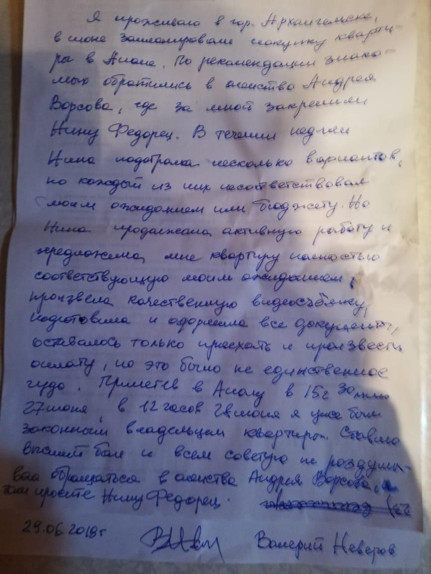 ЗаботаЯ проживаю в городе Архангельске, в июне запланировали покупку квартиры в Анапе. По рекомендации знакомых обратились в агентство Андрея Ворсова, где за мной закрепили Нину Федорец. В течении недели Нина подобрала несколько вариантов, но каждый из них не соответствовал моим ожиданиям или бюджету. Но Нина продолжала активную работу и предложила мне квартиру полностью соответствующую моим ожиданиям, произвела качественную видеосъемку, подготовила и оформила все документы, оставалось только приехать и произвести оплату, но это было не единственное чудо. Прилетев в Анапу в 15 ч.30 мин 27 июня, в 12 часов 28 июня я уже был законным владельцем квартиры. Ставлю высший бал и всем советую не раздумывая обращаться в агентство Андрея Ворсова, и там спросите Нину Федорец.
