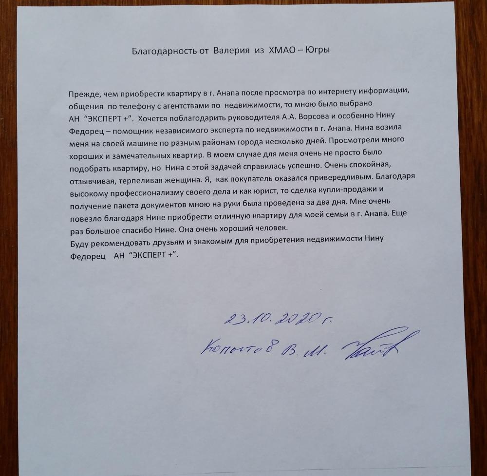 Прежде, чем приобрести квартиру в г. Анапа после просмотра по интернету информации, общения по телефону с агентствами по недвижимости, то мною было выбрано АН "ЭКСПЕРТ+". Хочется поблагодарить руководителя А.А. Ворсова и особенно Нину Федорец ‒ помощник независимого эксперта по недвижимости в г. Анапа.