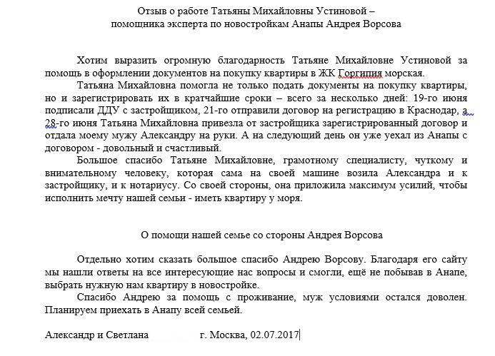 ЗаботаС Александром и Светланой мы общались только по электронной почте. К тому моменту, когда они приехали в Анапу, мне необходимо было отлучиться по делам на неделю. За эту неделю они отлично поладили с моей сотрудницей Татьяной, о чём не забыли оставить отзыв. Увидеться в этот раз у нас так и не получилось, но на сдаче дома в эксплуатацию, я уверен, мы увидимся. Спасибо друзья, мне очень приятно было получить ваш отзыв о нашей работе!