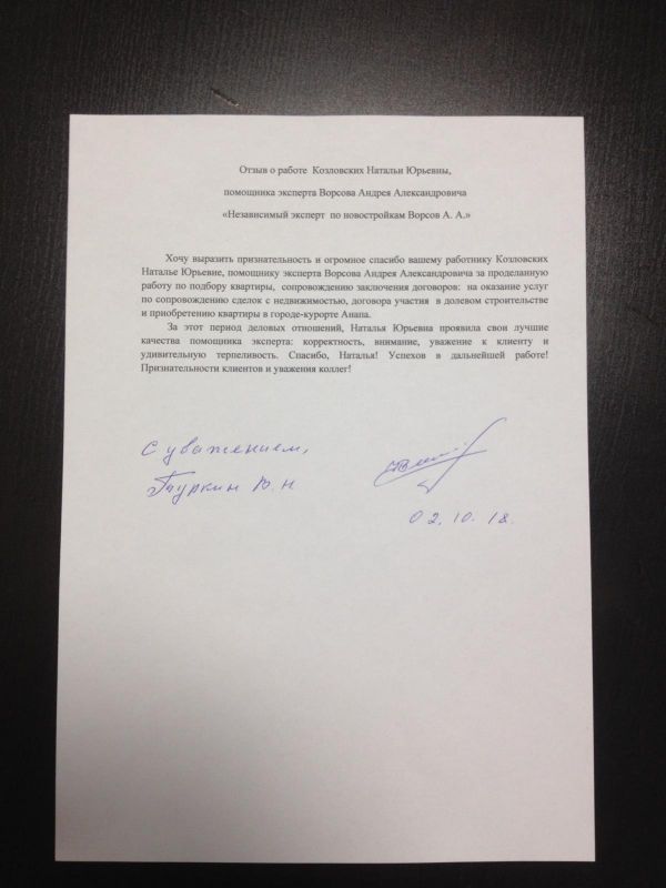 Хочу выразить признательность и огромное спасибо вашему работнику Козловских Наталье Юрьевне, помощнику эксперту Ворсова Андрея Александровича за проделанную работу по подбору квартиры, сопровождению заключения договоров: на оказание услуг по сопровождению сделок с недвижимостью, договора участия в долевом строительстве и приобретению квартиры в городе-курорте Анапа.
