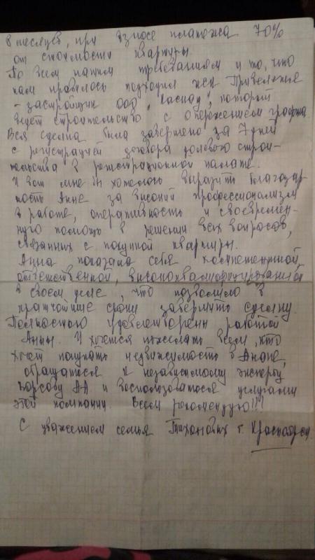 И вот мне бы хотелось выразить благодарность Анне за высокий профессионализм в работе, оперативность и своевременную помощь в решении всех вопросов, связанных с покупкой квартиры.
