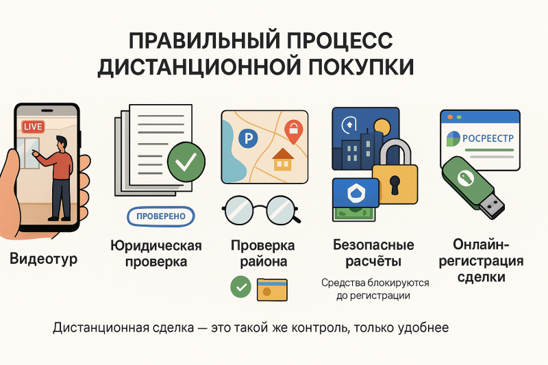 Важно понять, что дистанционная сделка — это не «покупка наугад». Это такой же процесс, как и обычная покупка, просто шаги выполняются не лично, а через сервисы, юристов и проверенные процедуры. Если делать всё правильно, дистанционная сделка будет безопаснее обычной — потому что каждый шаг фиксируется в видео, в переписке, в сервисах.