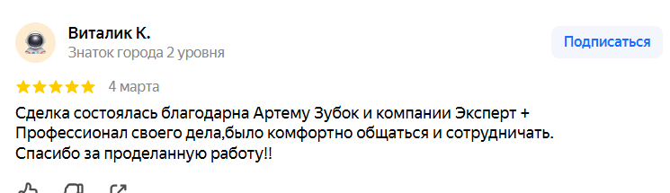 Сделка состоялась благодарна Артему Зубок и компании Эксперт+. Профессионал своего дела, было комфортно общаться и сотрудничать. Спасибо за проделанную работу!!