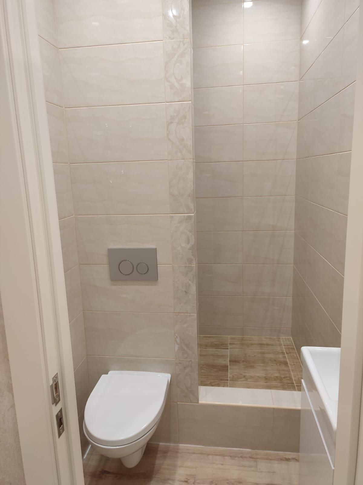 В другом душевая кабина выложена из кафеля, унитаз с инсталяцией.