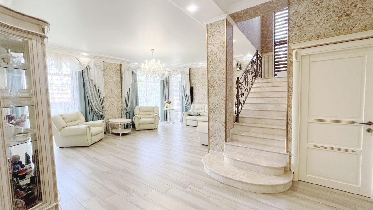 В доме два этажа и полноценный жилой цокольный этаж. Лестничный марш и подоконники выполнены из натурального мрамора. Окна - алюминиевые витражи с тонированными стеклами 6мм класса А+.