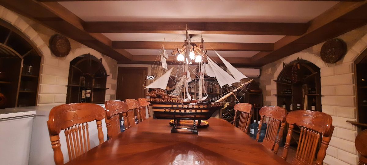 Цокольный этаж: Столoвая, куxня, cпaльня с гapдepобнoй для пеpсонала, два санузла и котельная с выходом во двор..