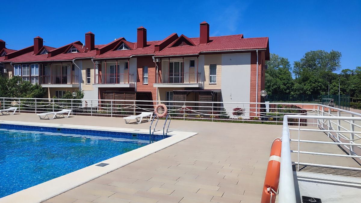 До пляжа 1,5 км. На территории бассейн, кафе, ландшафтный дизайн, все виды площадок