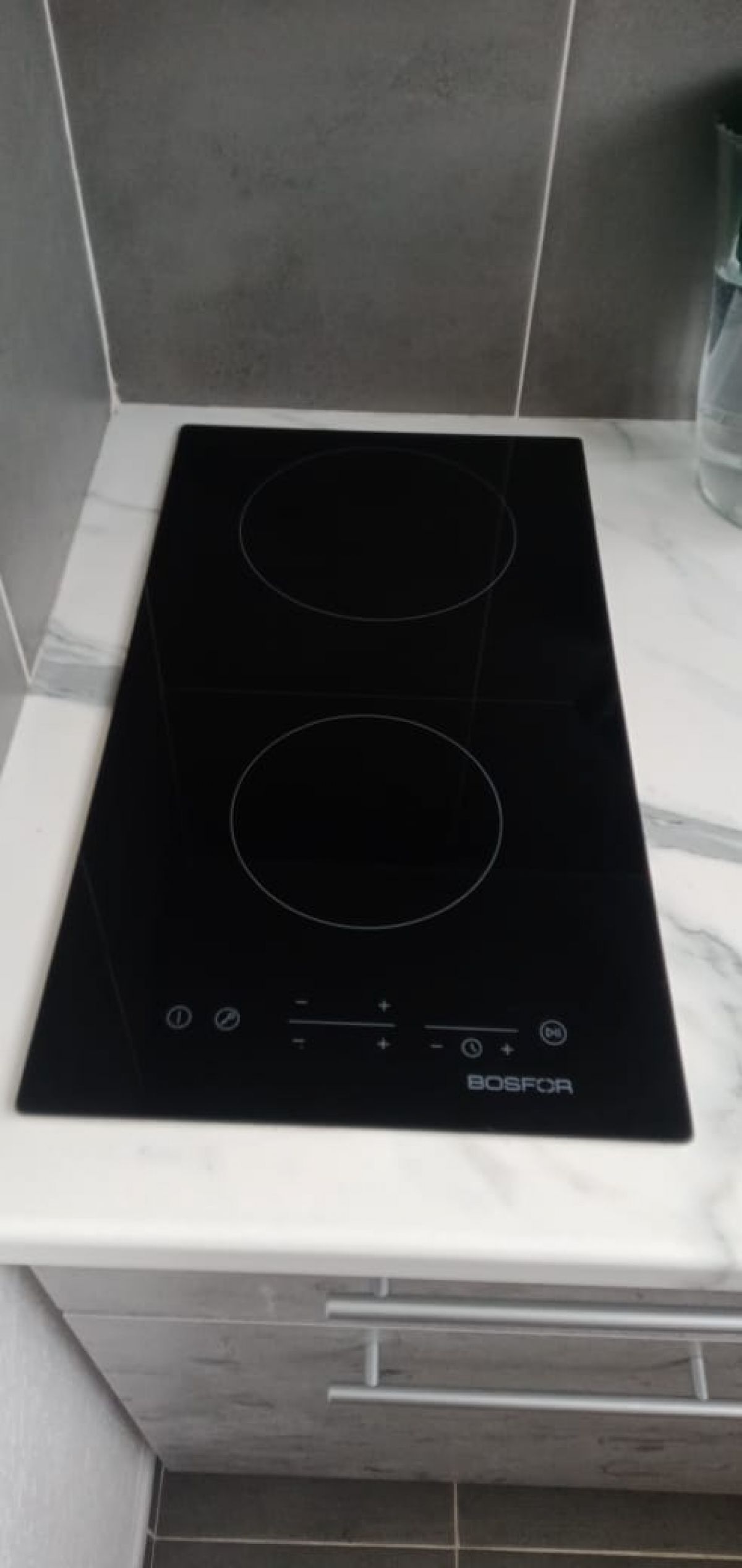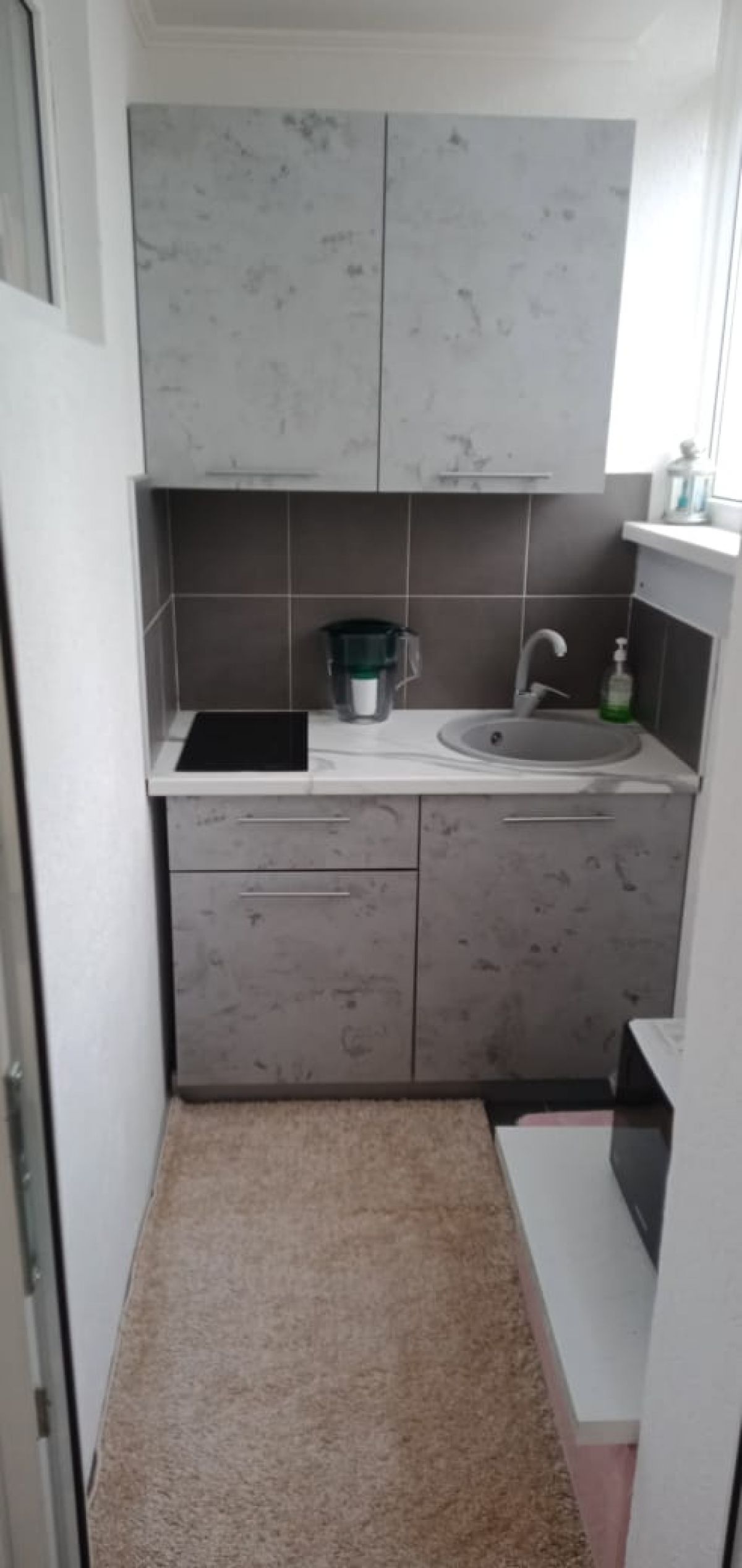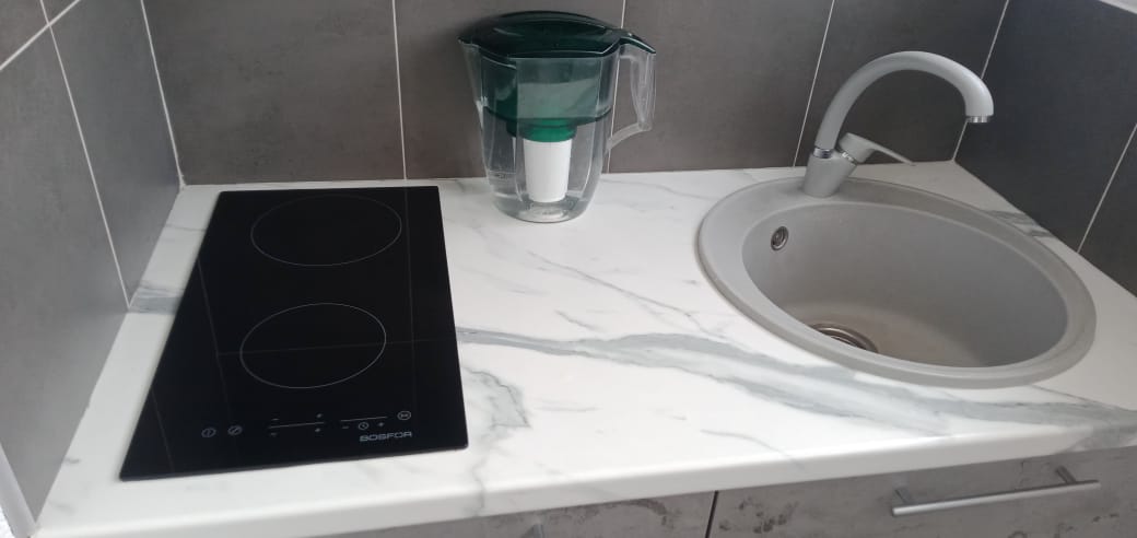 - Кухонный гарнитур, обеденная группа, холодильник и свч