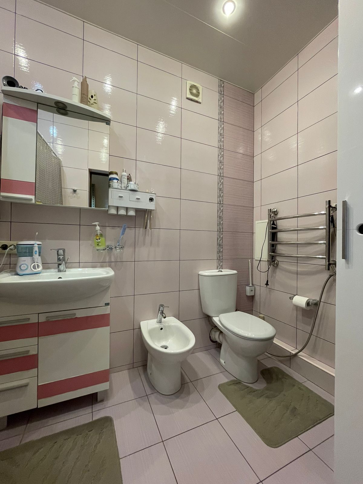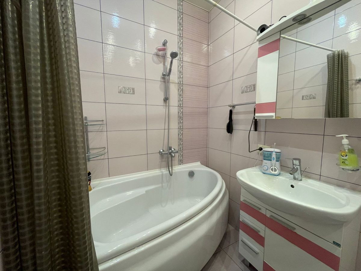 Совмещенный санузел просторный, 5.3 кв.м. с большой ванной, гигиеническим душем, установлена необходимая мебель для ванной комнаты, для хранения моющих средств и мелочей.