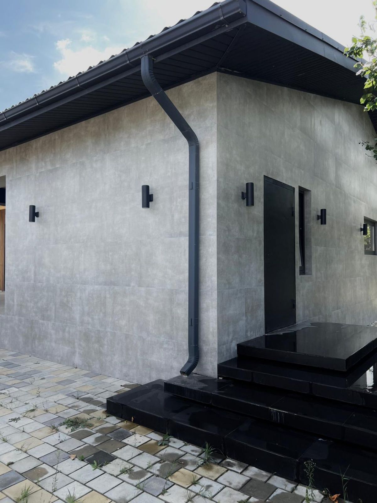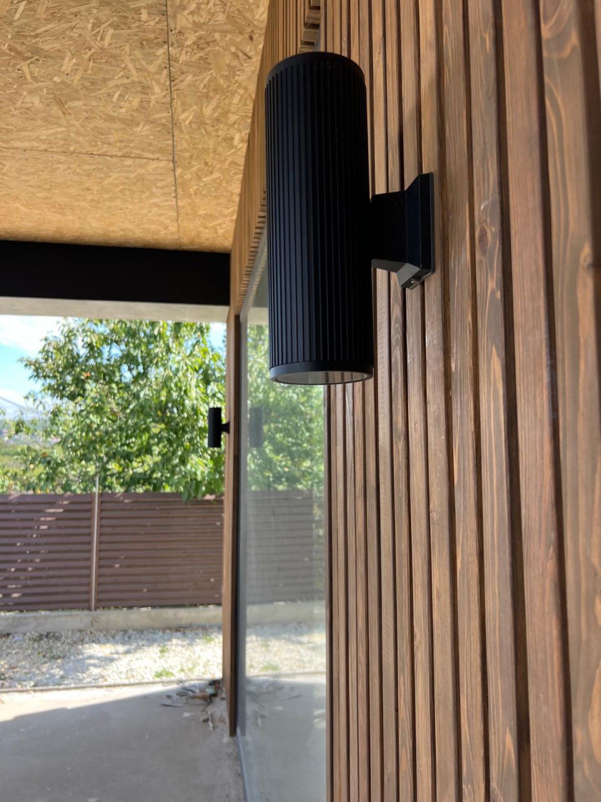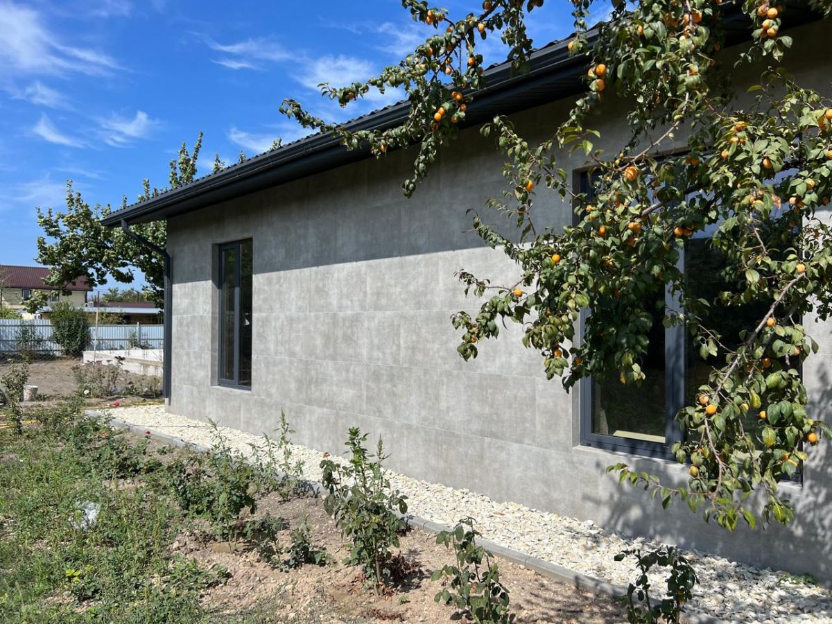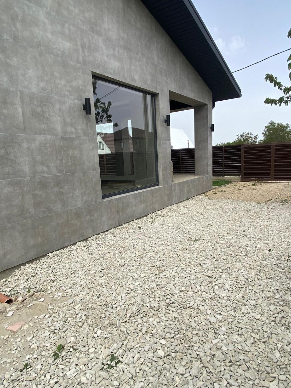 Дом выполнен из монолитного каркаса. Стены наружные из керамзитового блока 46 см оштукатурены и облицованы керамогранитом. Перегородки - кирпичные. Крыша- металочерепица (ral 7024), утеплитель 150 мм. В доме установлены алюминиевые окна в пол (ral 7024), выход на террасу через сдвижной портал. Входные ступени (парящие) с подогревом. Выполнена подсветка дома и входной группы (ступени). Внутренняя разводка электрики. Выполнена внутренняя предчистовая отделка.