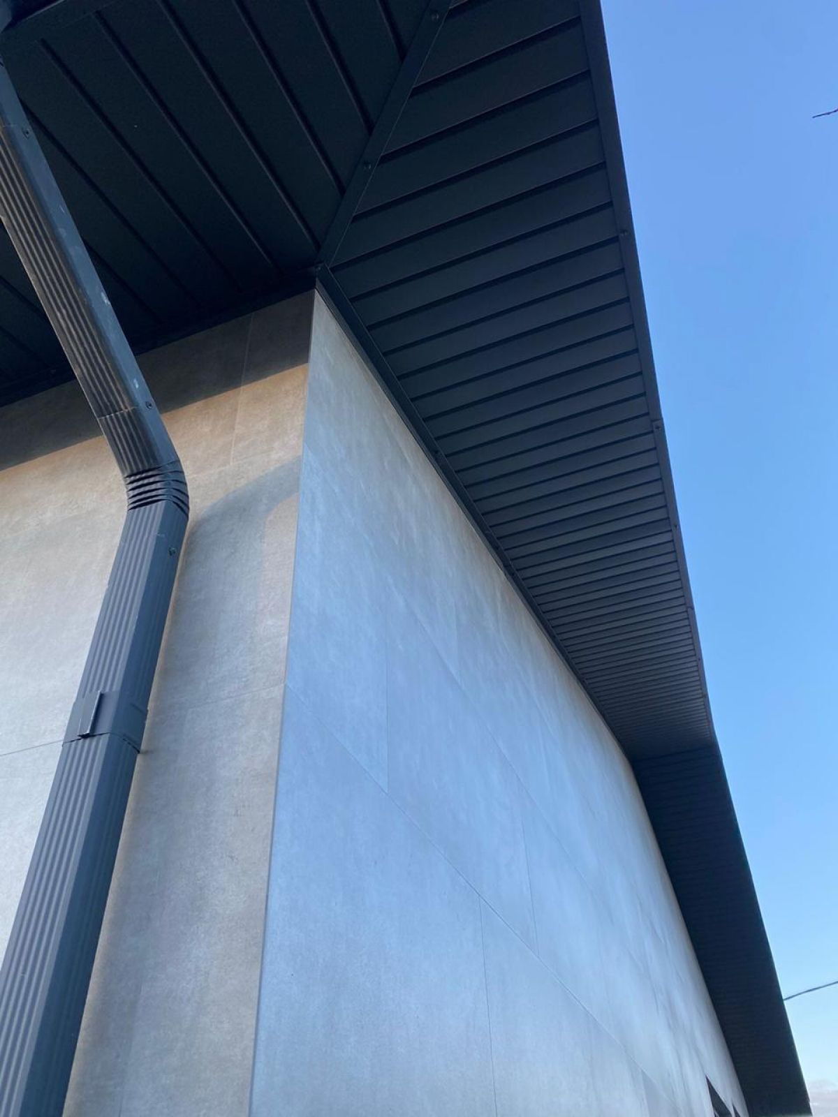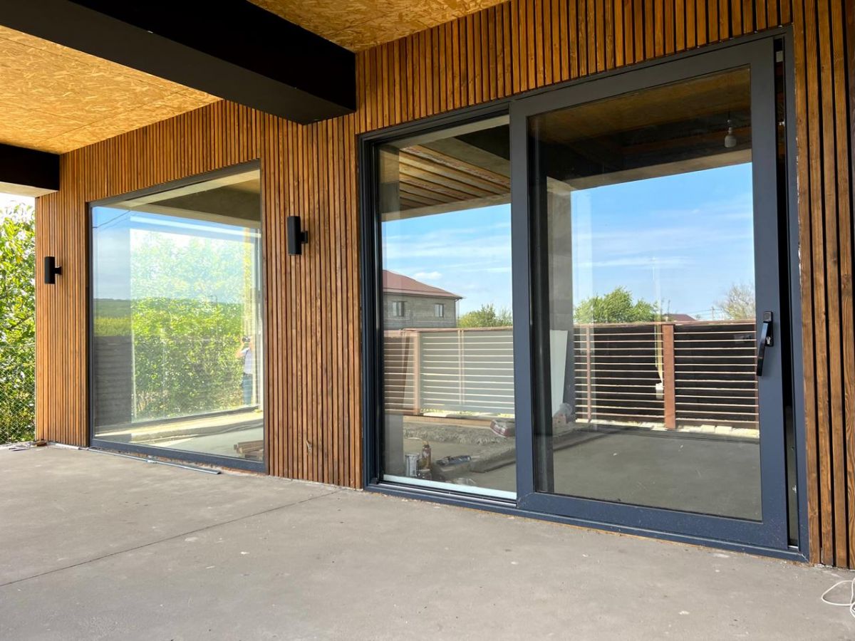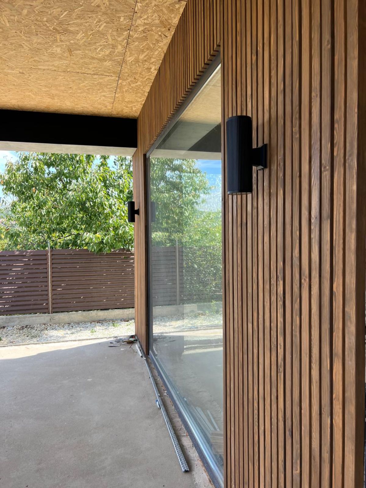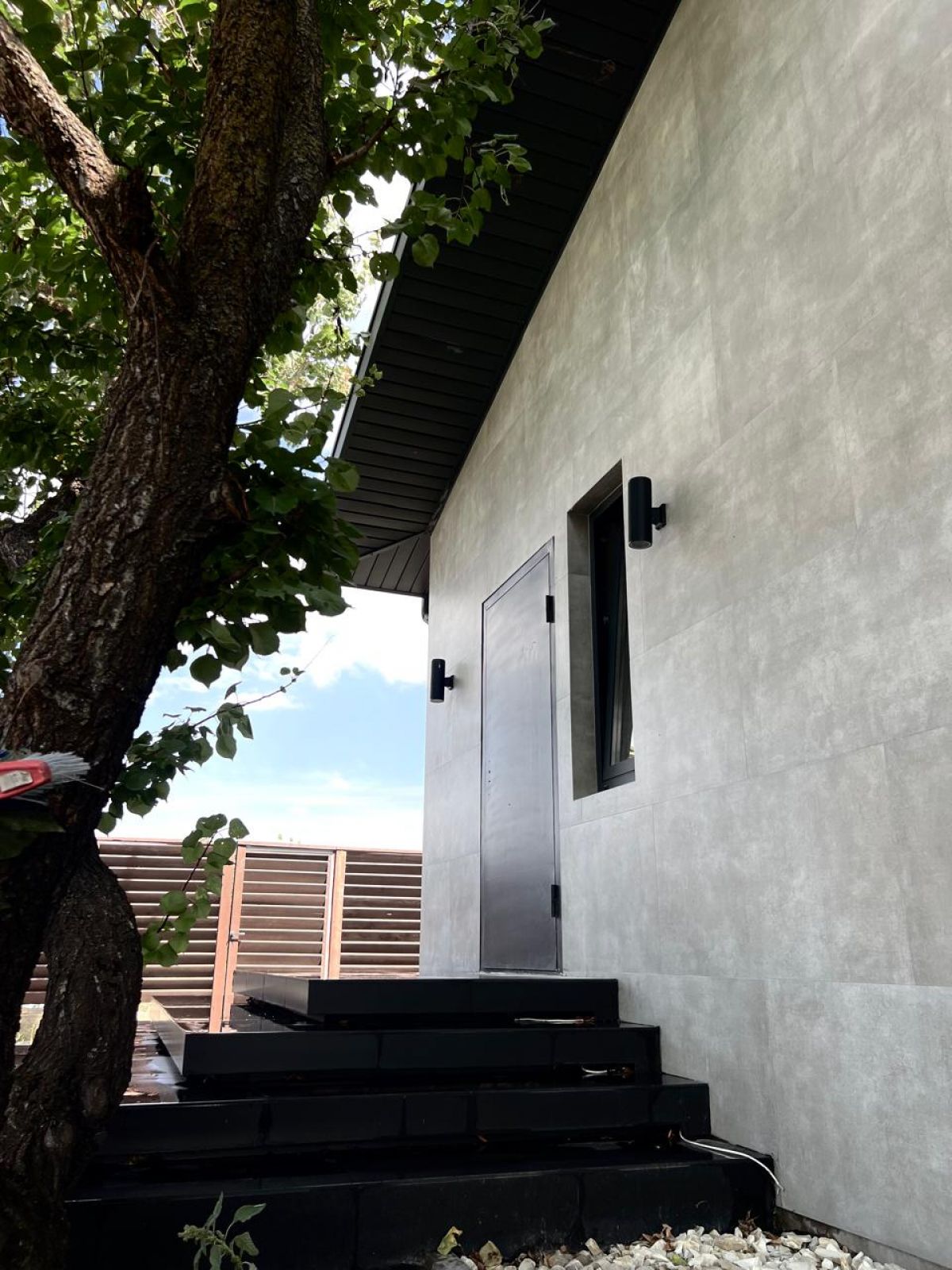 Дом выполнен из монолитного каркаса. Стены наружные из керамзитового блока 46 см оштукатурены и облицованы керамогранитом. Перегородки - кирпичные. Крыша- металочерепица (ral 7024), утеплитель 150 мм. В доме установлены алюминиевые окна в пол (ral 7024), выход на террасу через сдвижной портал. Входные ступени (парящие) с подогревом. Выполнена подсветка дома и входной группы (ступени). Внутренняя разводка электрики. Выполнена внутренняя предчистовая отделка.