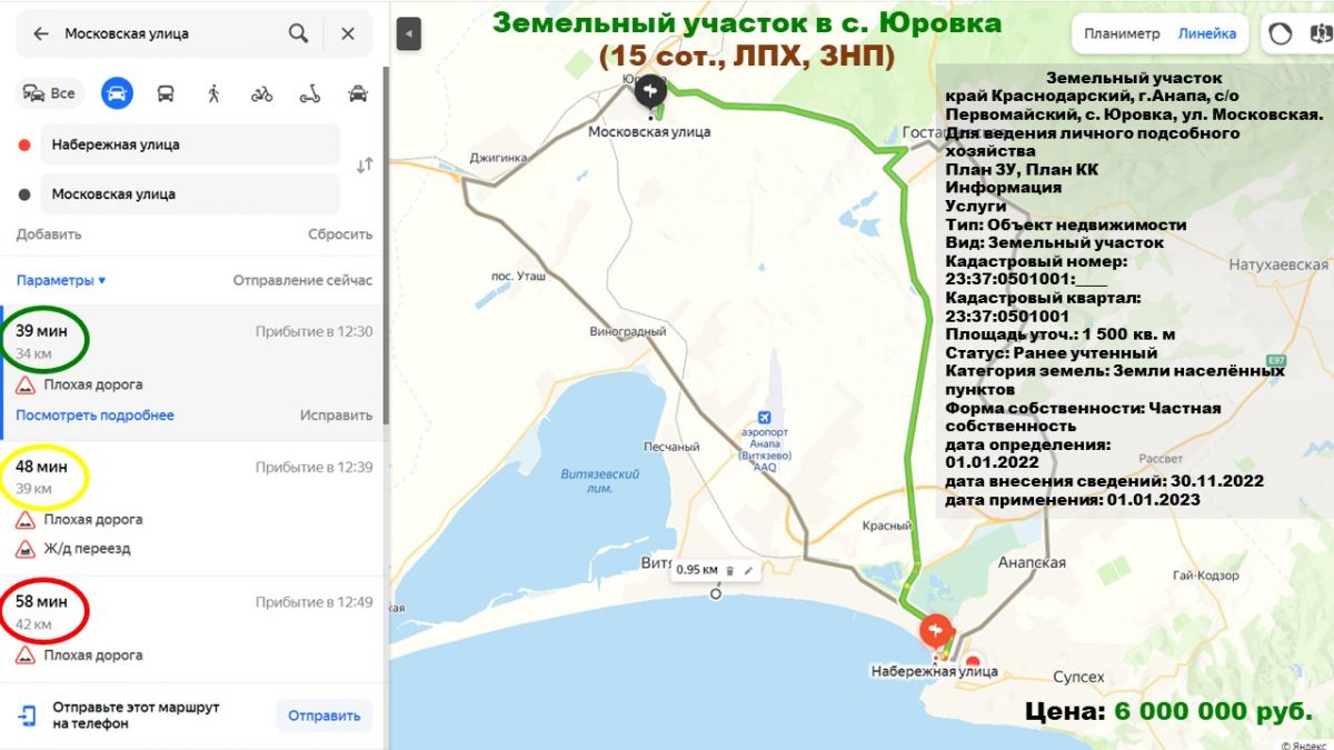 Участок 15 сот. (ЛПХ) в селе Юровка - 20 минут (25 км) от песчаных пляжей села Витязево и станицы Благовещенской («Новая Анапа») на автомобиле!