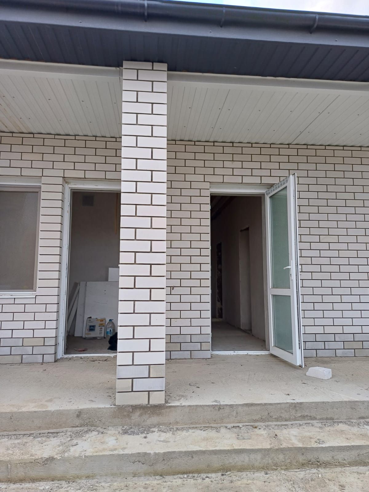 фундамент - ленточный; материал стен керамзитобетонный блок; утеплитель (5 см.); облицовка - белый кирпич; крыша - металлочерепица.