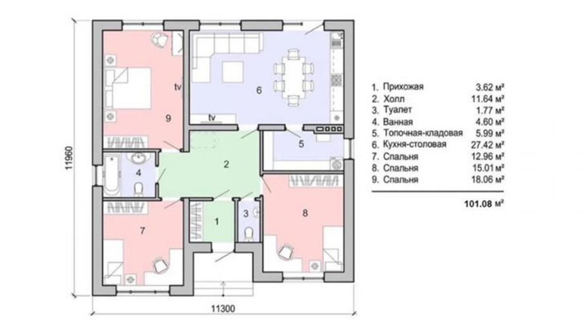 Дом, внутренней площадью 101,08 м2 (размер 11,3 м х 11,96 м):