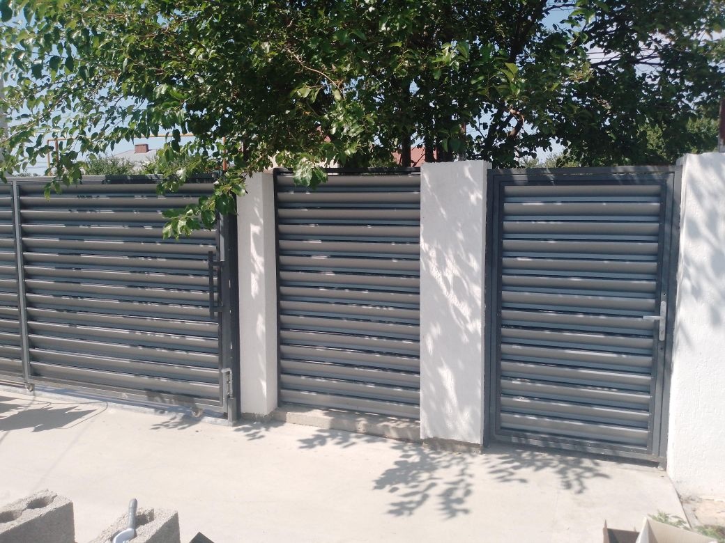 Фасад участка огорожен забором из металлопрофиля с воротами и калиткой.