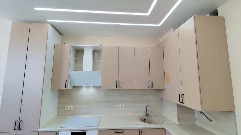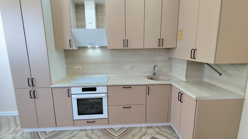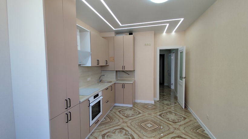 В коридоре есть большая ниша под гардеробную. Большая жилая комната со спальным местом. В кухне установлен кухонный гарнитур со встроенной бытовой техникой.