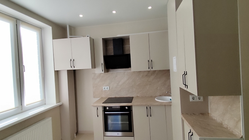 Установлен кухонный гарнитур, спальня, сантехника и сделаны трассы под сплит-системы.