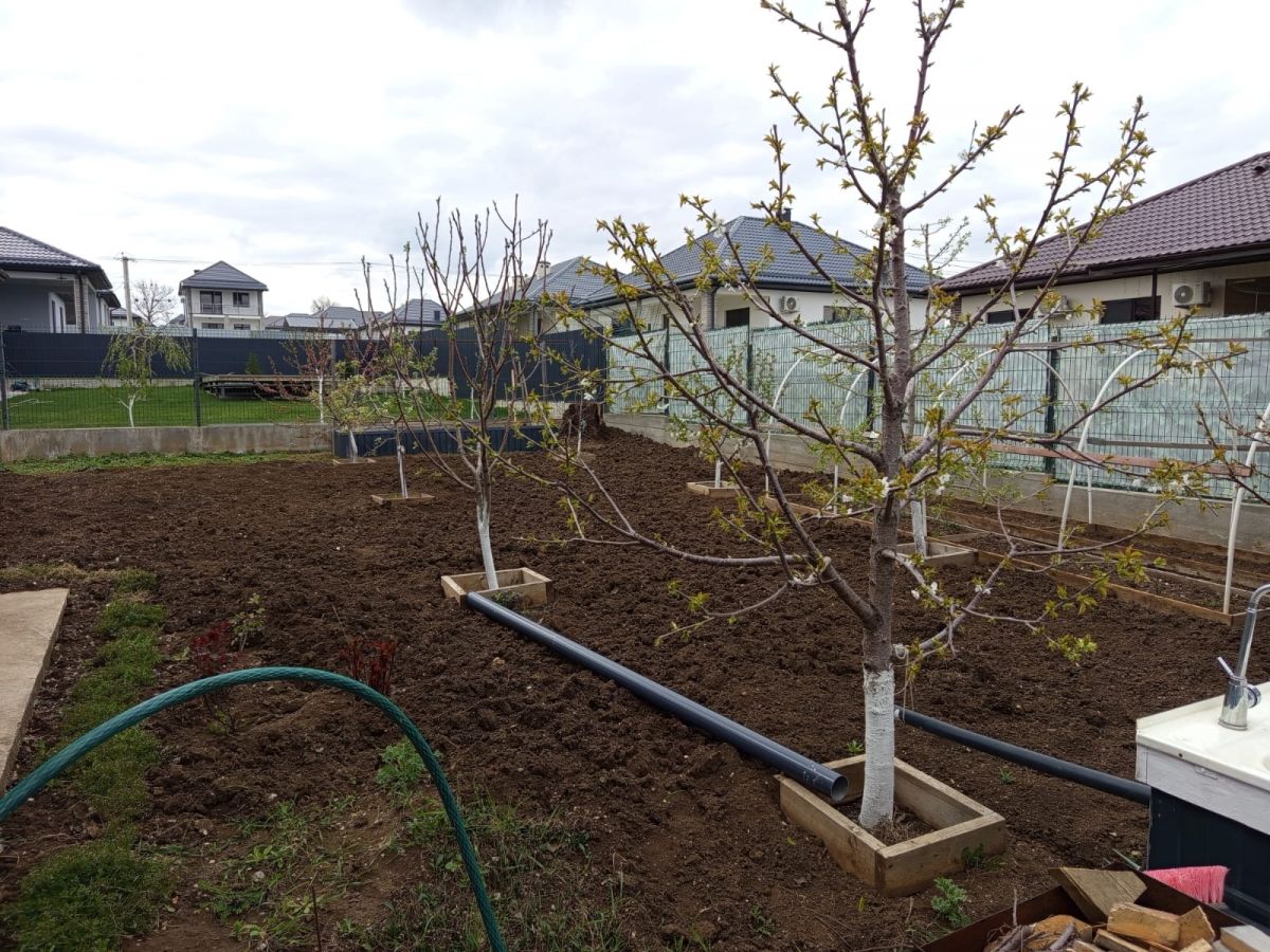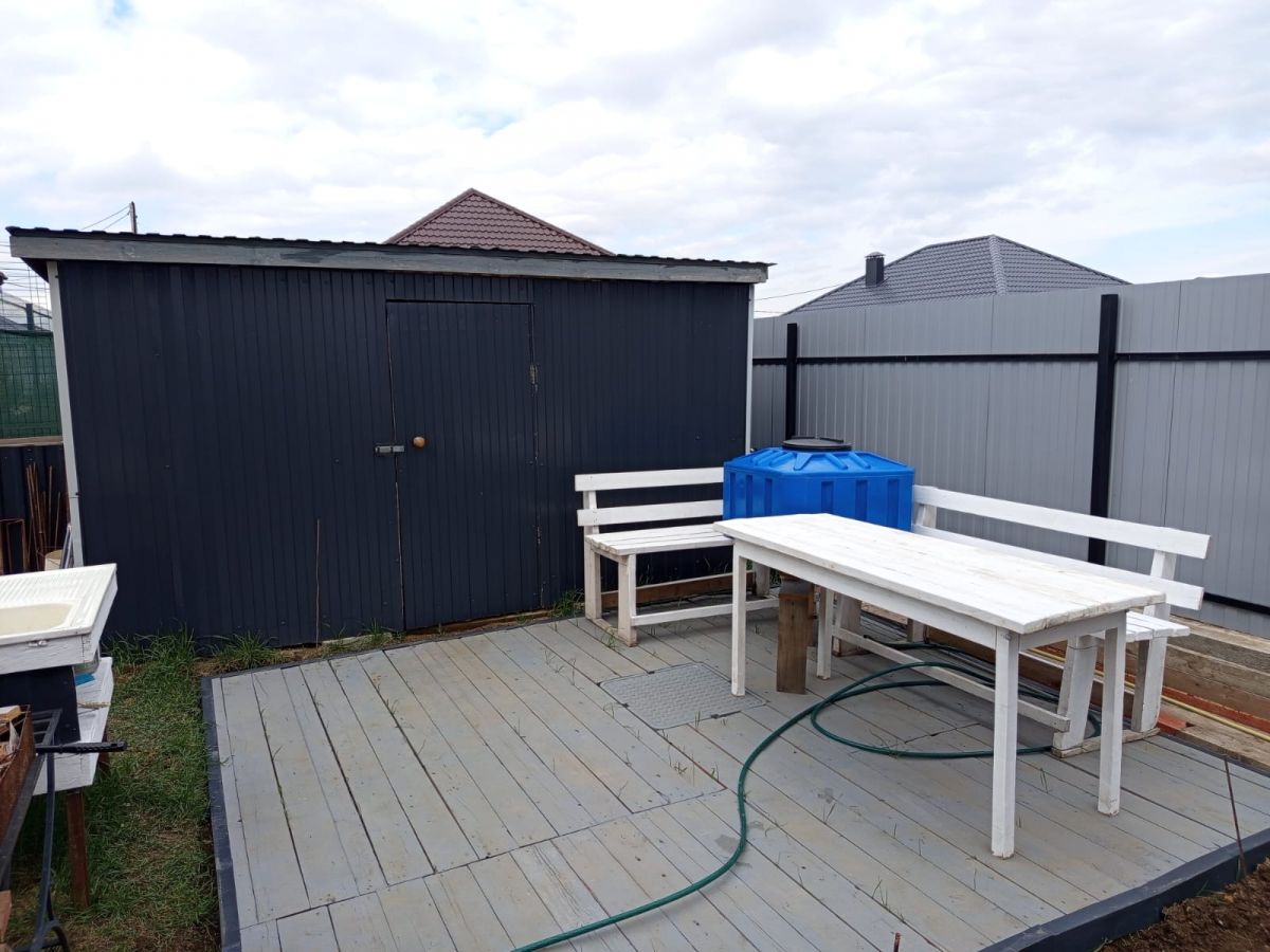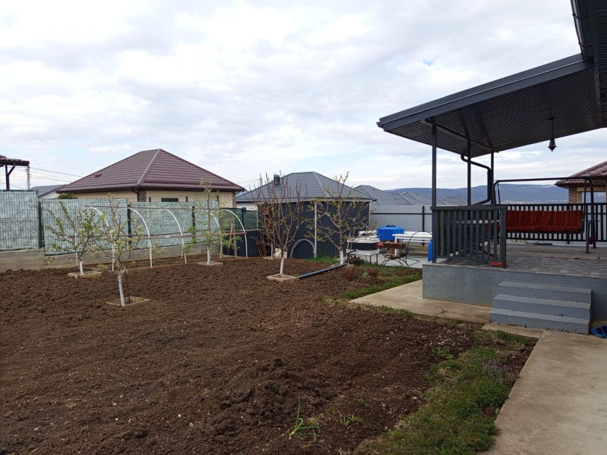 На участке: бетонированная отмостка и место под стоянку автомобиля; бытовка; место под мануальную зону, высажены фруктовые деревья и ягодные кустарники.