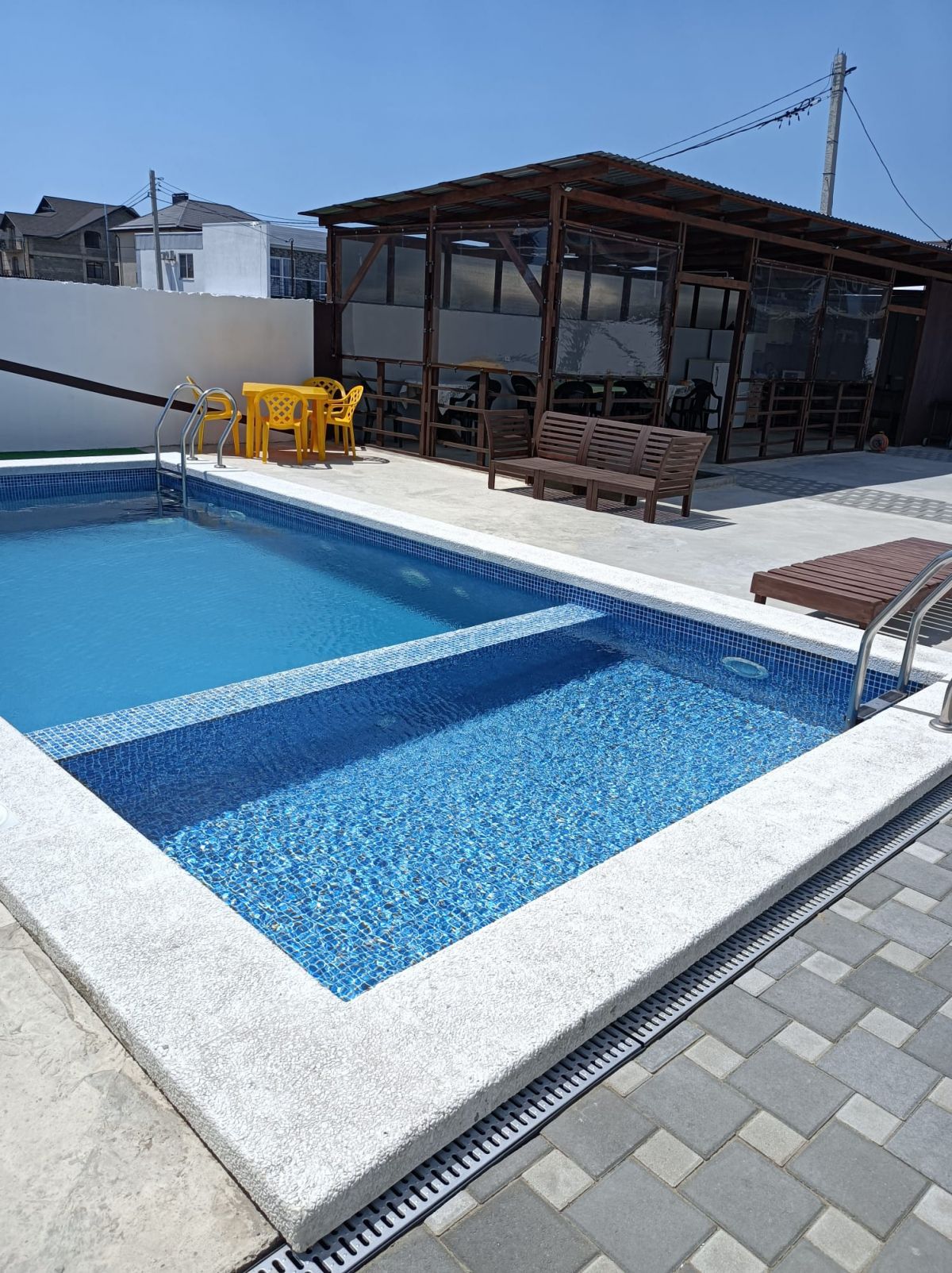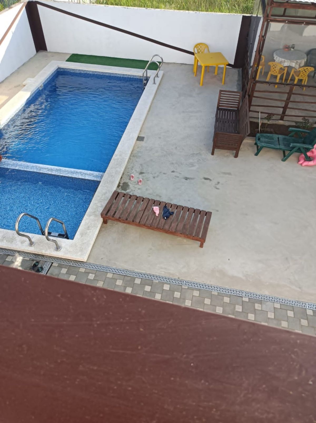 На придомовой территории: большой бассейн, детская игровая зона, просторная лаунж-зона - это место для отдыха и релаксации и летний душ от центральных коммуникаций. По периметру участка ограждение – бетонный забор.