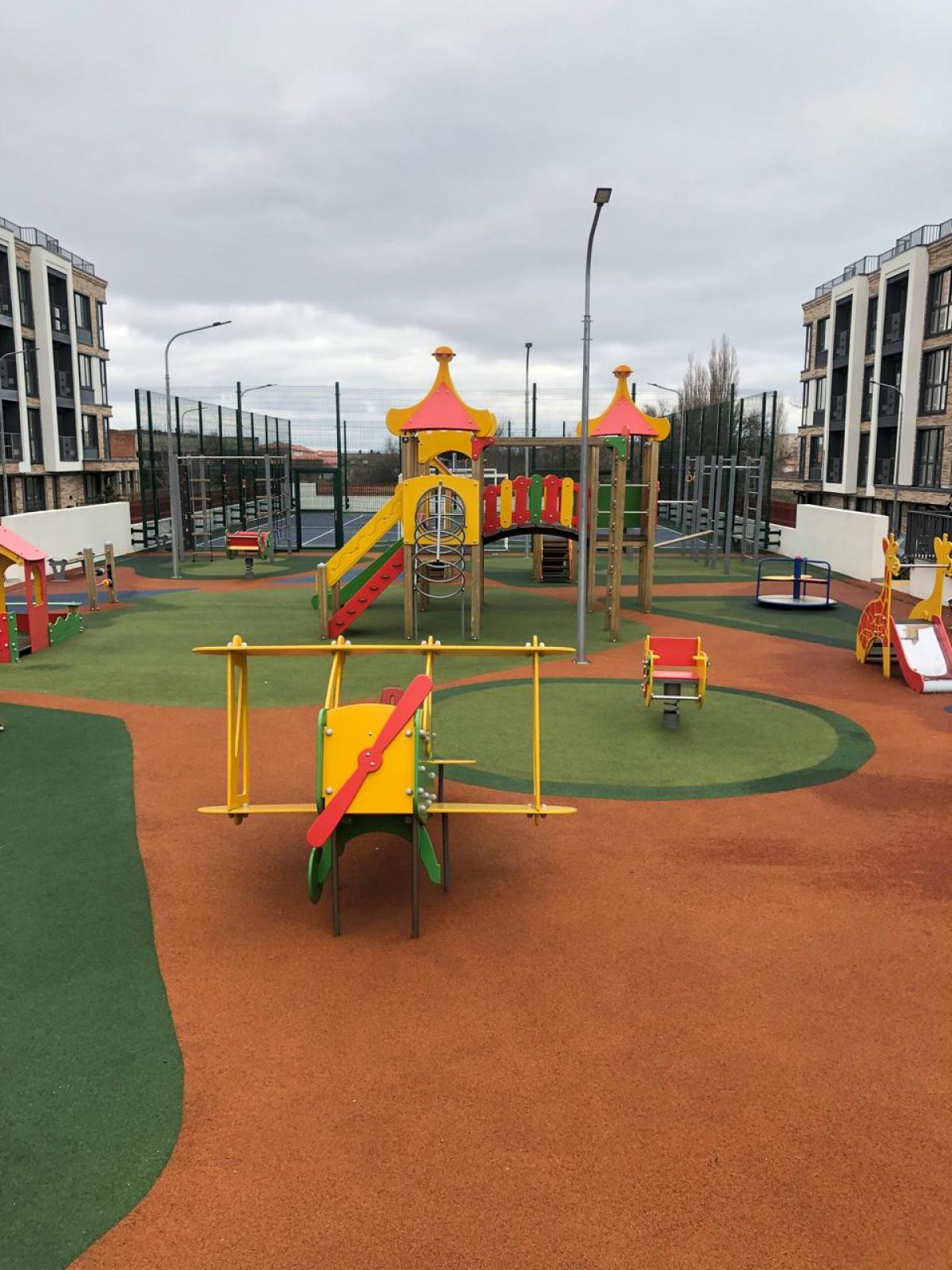 большая спортивная площадка с зоной воркаута, детская площадка для ребят разных возрастов, место для отдыха взрослых;