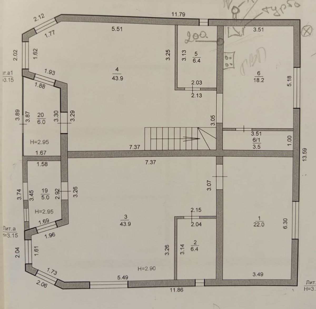 На первом этаже - располагается: прихожая - 6,0 м.кв., просторные кухня-столовая - 18,2 м.кв. и гостиная - 43,9 м.кв., хозяйственная комната - 3,5 м.кв., большой санузел - 6,4 м.кв. и широкая лестница на второй этаж.