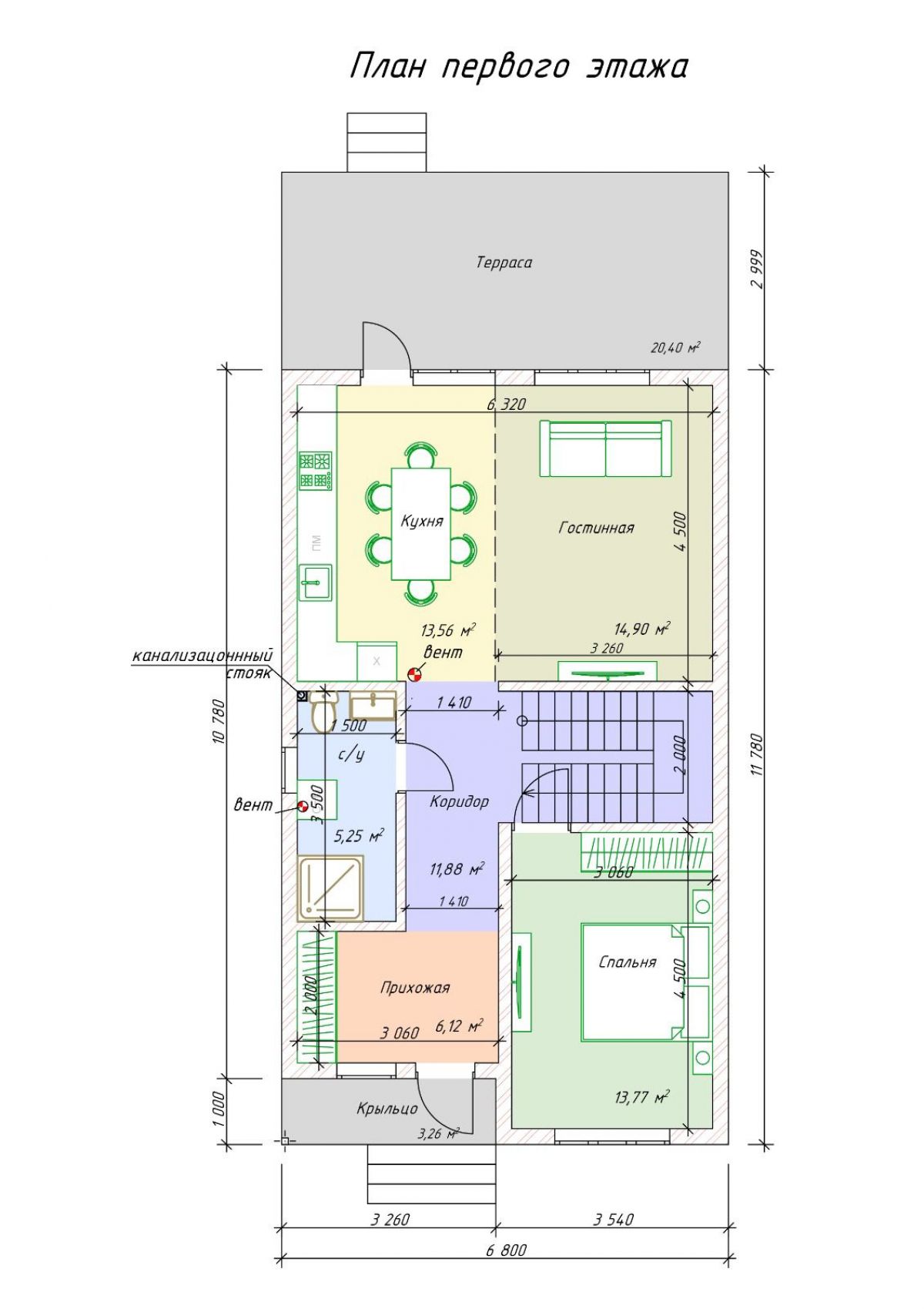 кухня (13,5 м.кв.) + гостиная (15 м.кв.) с выходом на большую террасу – 20 м.кв.;