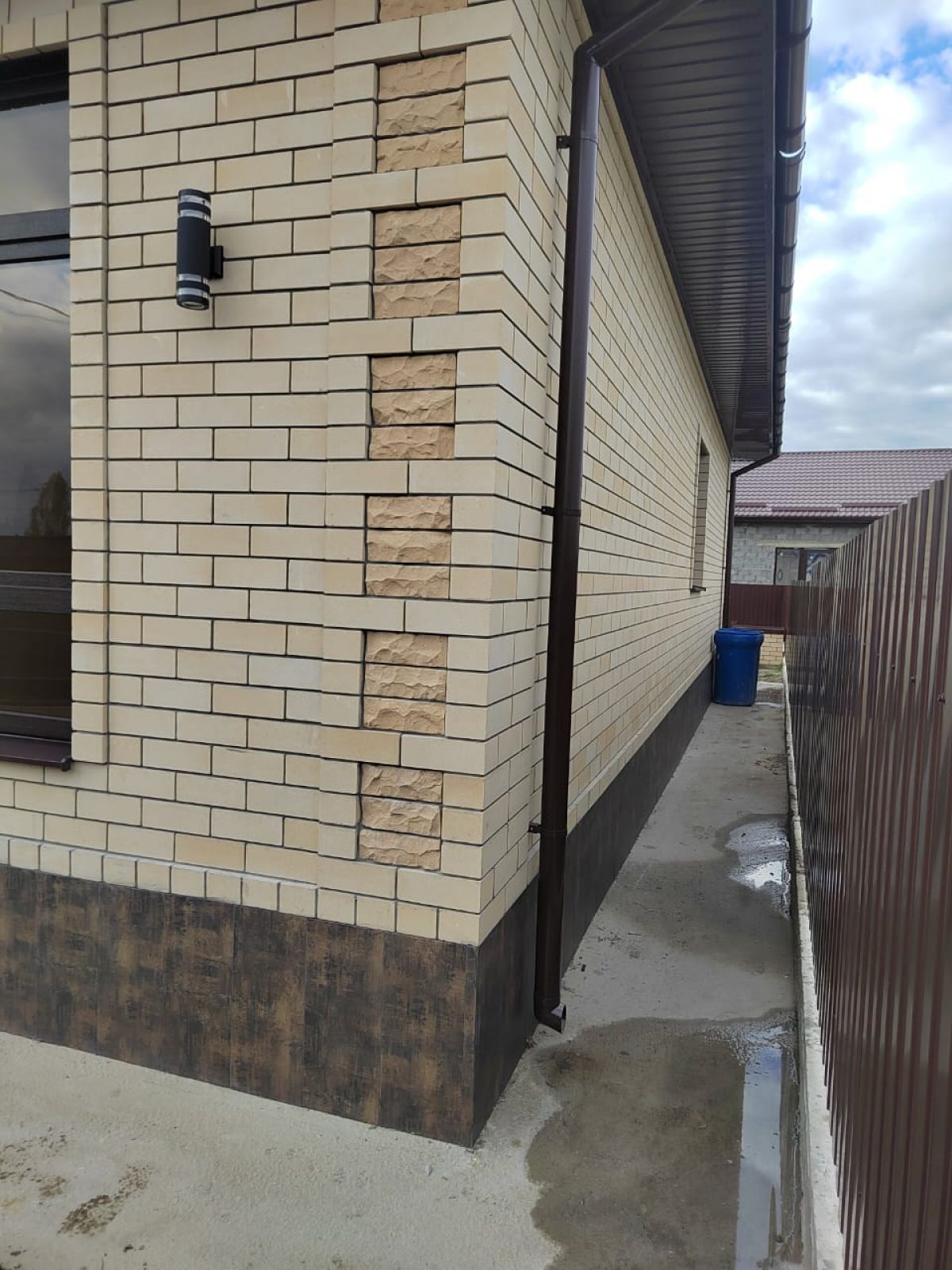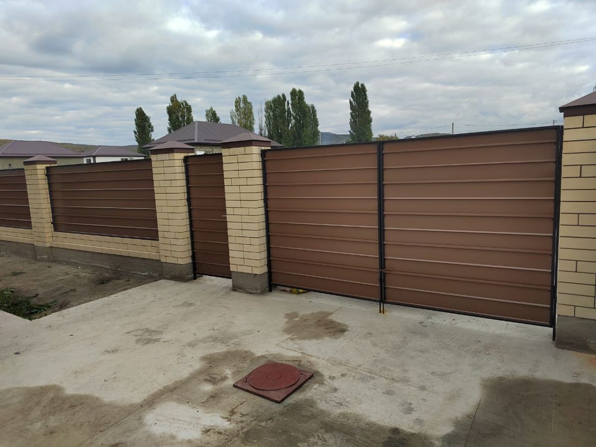 Фасад и забор выполнены из кирпича, территория облагорожена.