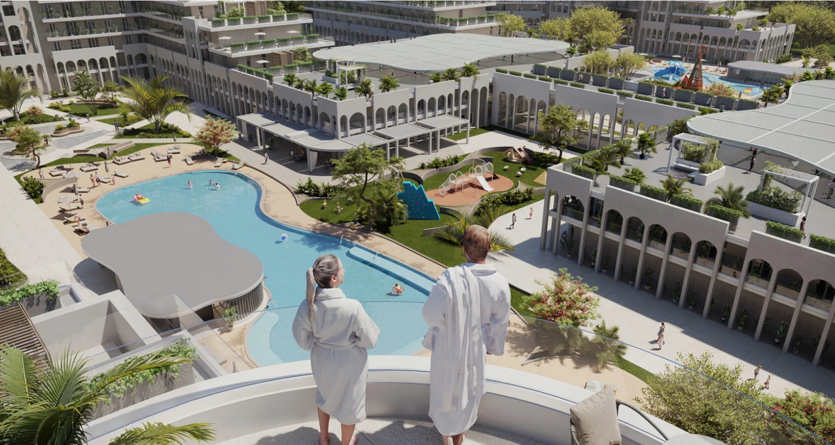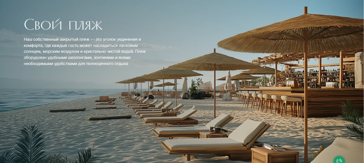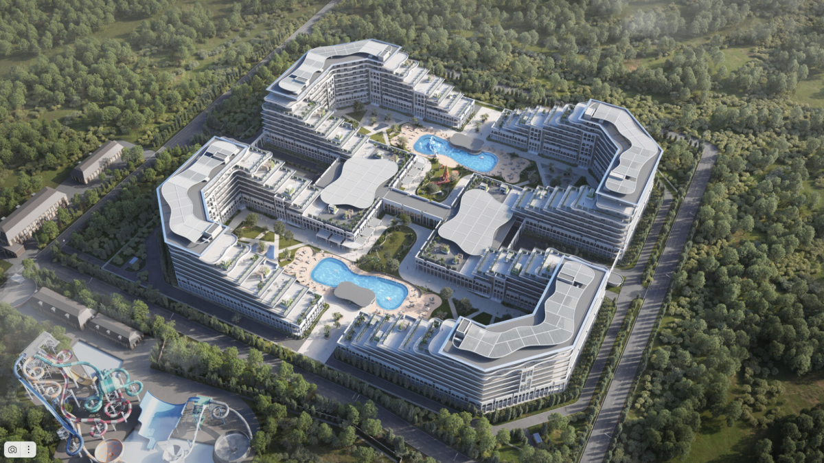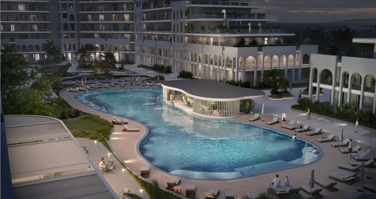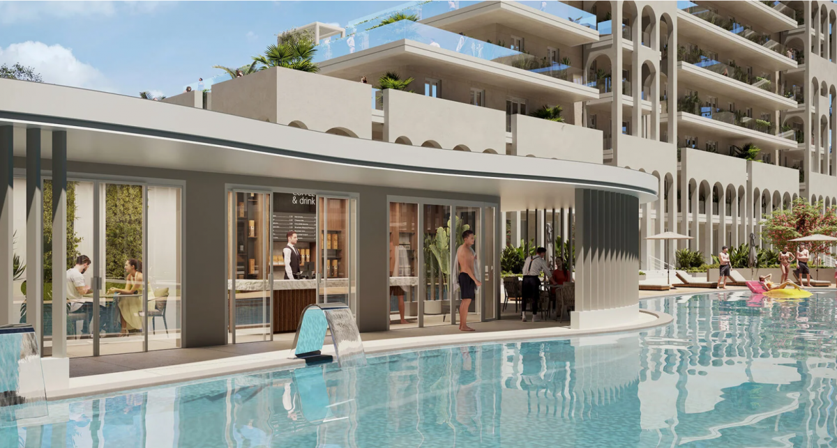 На территории расположены два бассейна, один из которых с подогревом и детской зоной, а также детская и спортивные площадки. Ландшафтный дизайн включает зоны для отдыха, озелененные участки и прогулочные дорожки. Рядом с взрослым бассейном расположена зона отдыха с баром, где можно насладиться напитками и расслабиться.