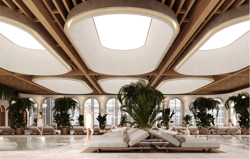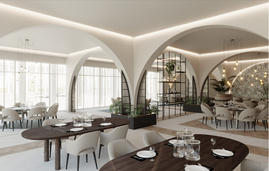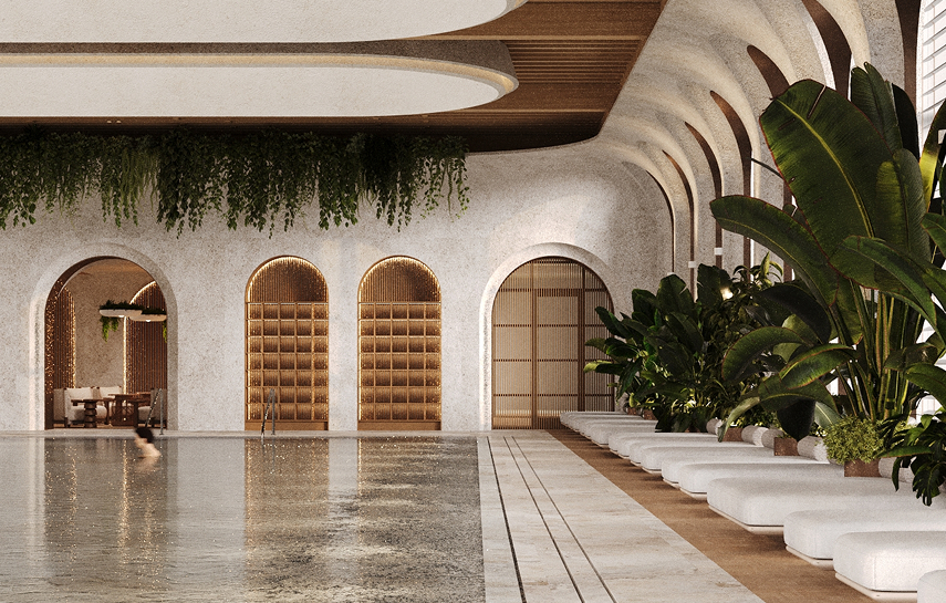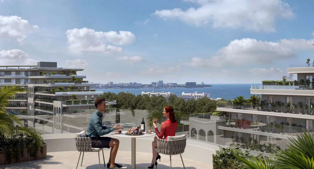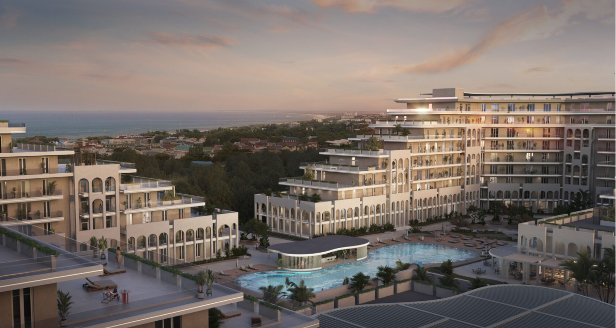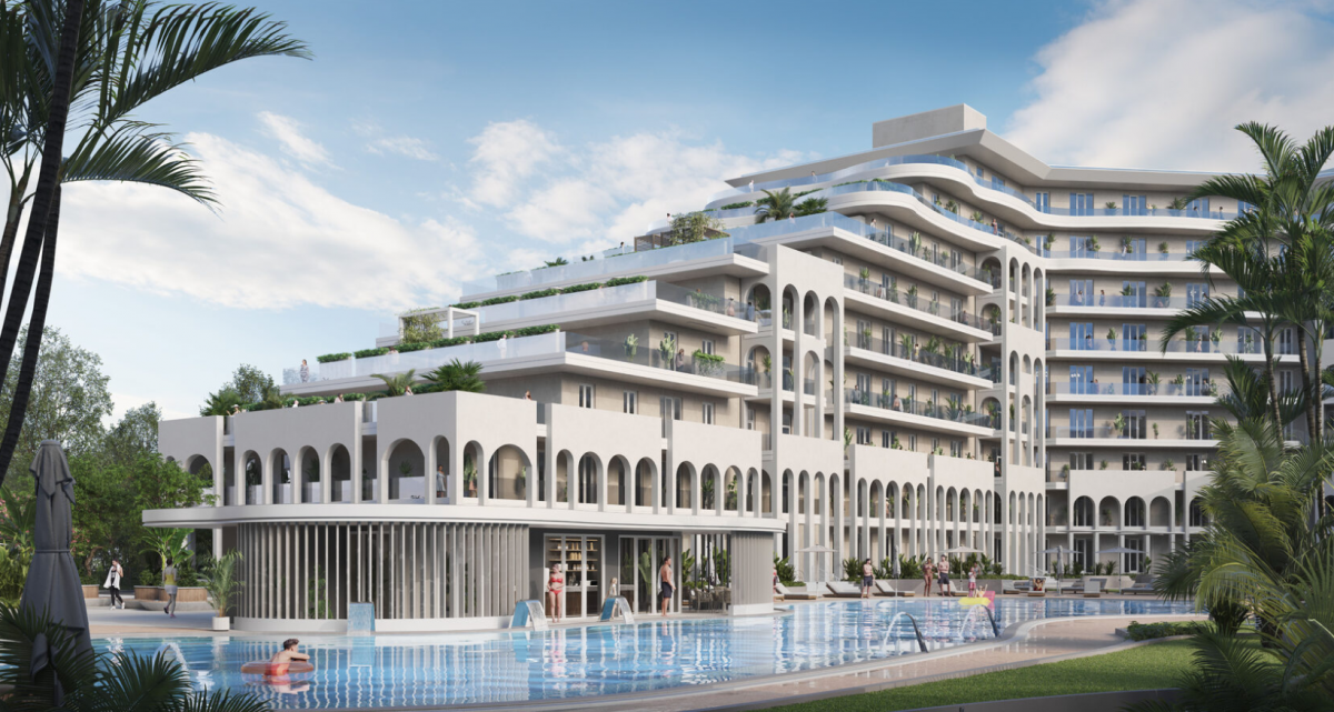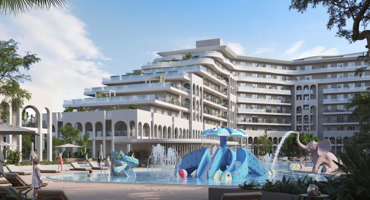 На территории расположены два бассейна, один из которых с подогревом и детской зоной, а также детская и спортивные площадки. Ландшафтный дизайн включает зоны для отдыха, озелененные участки и прогулочные дорожки. Рядом с взрослым бассейном расположена зона отдыха с баром, где можно насладиться напитками и расслабиться.