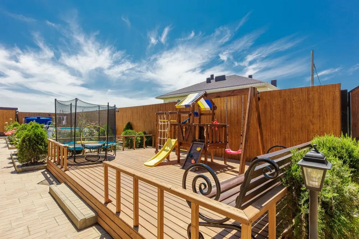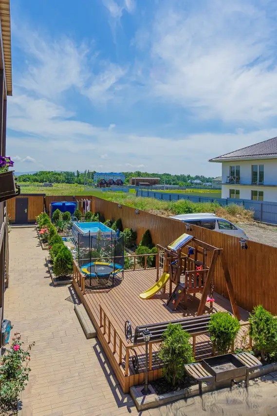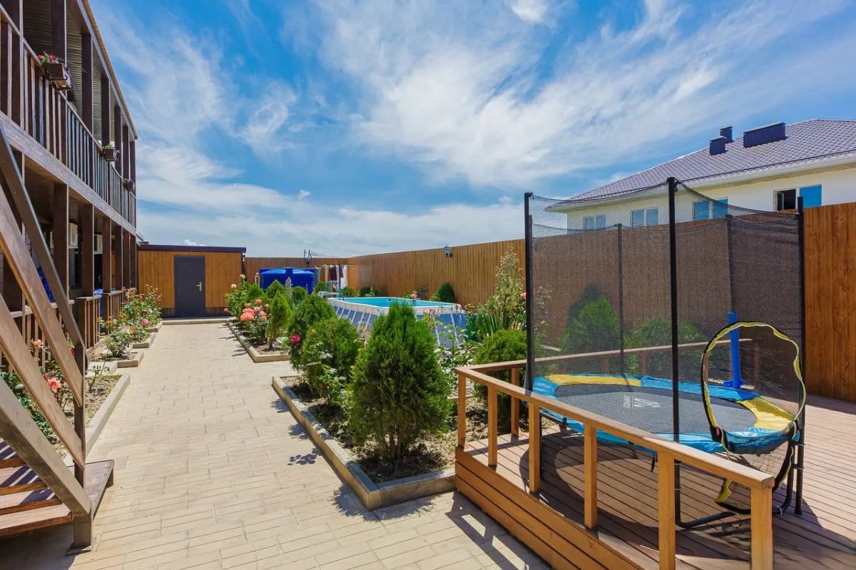 Во дворе детская игровая площадка, каркасный бассейн, мангал для приготовления шашлыка, столы, стулья, благоустроенный двор.