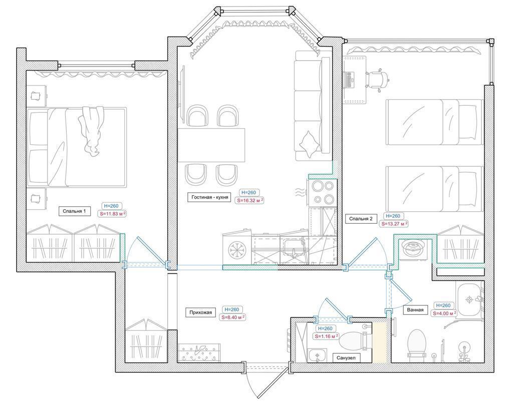 Планировка с двумя изолированными комнатами. Санузел раздельный.
