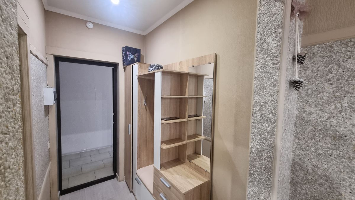 В прихожей располагается удобный шкаф. Совмещенный санузел ,зеркало, ванна, полотенцесушитель, стиральная машина, плитка на стенах и полах.