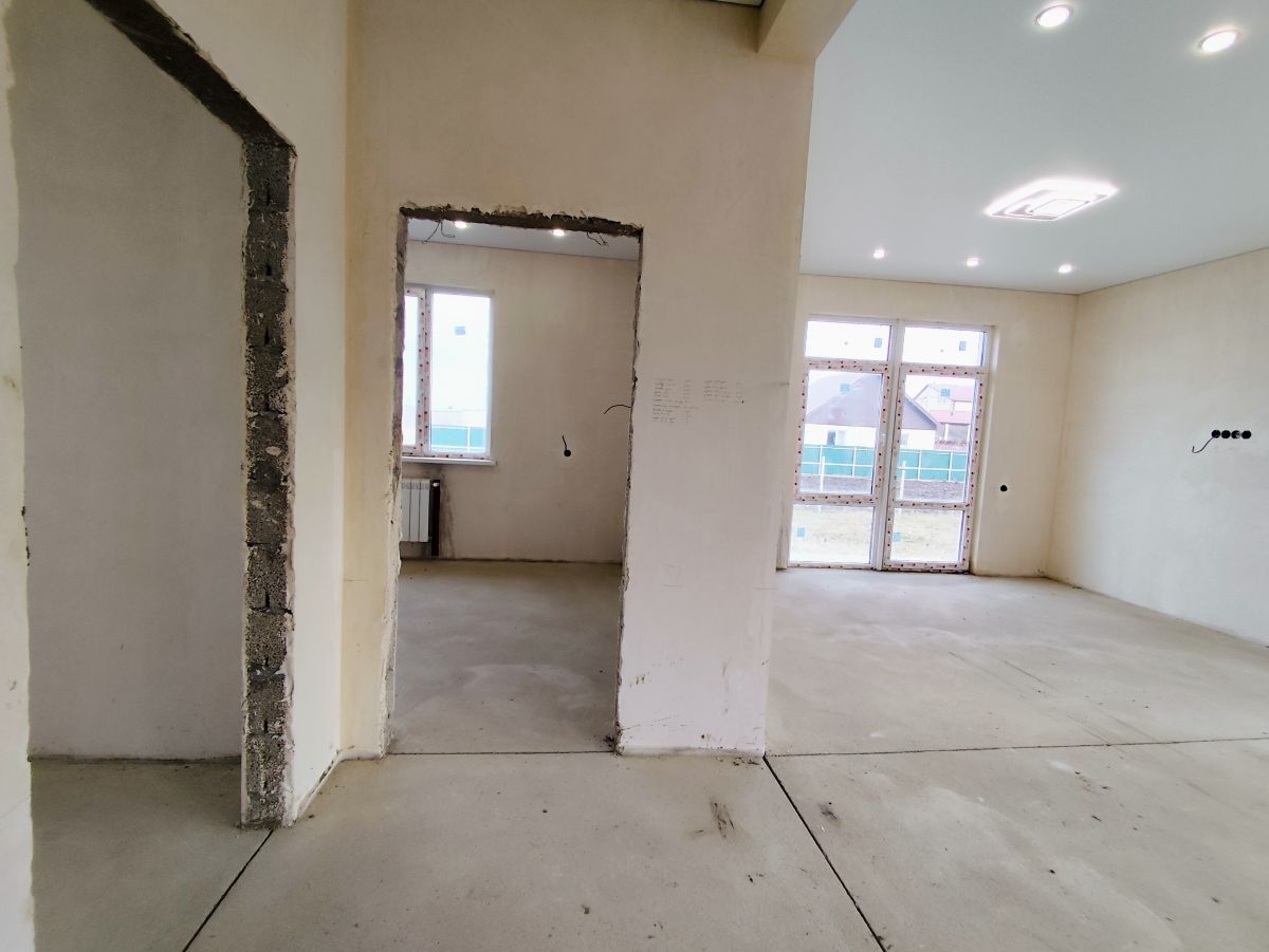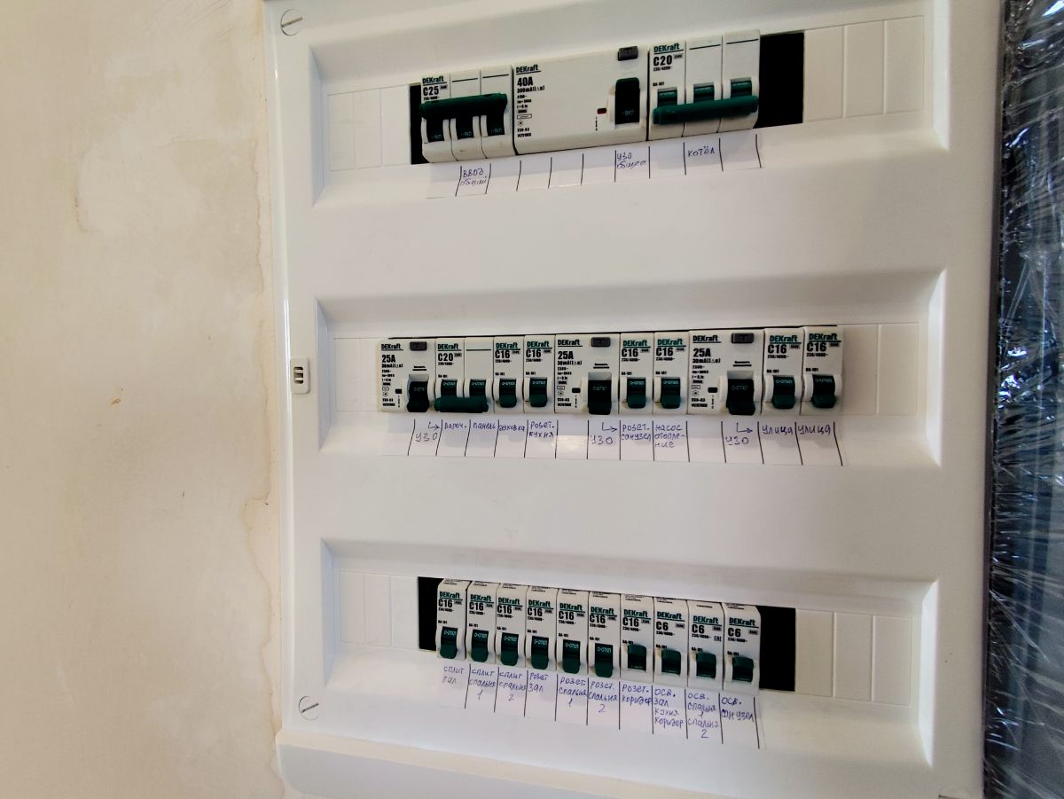 Отделка в доме - качественная предчистовая: выполнено утепление, монтаж теплых полов и стяжка пола, стены выровнены, оштукатурены, ошпатлеваны, сделана разводка электрики со всеми необходимыми выводами (под выключатели, розетки, кабели ТВ и оптиковолокно), натяжные потолки матовые белые с уже установленными светильниками и люстрами. Для отопления есть теплые полы и радиаторы отопления, электрокотел, расширительный бак и в прихожей шкаф для автоматов.