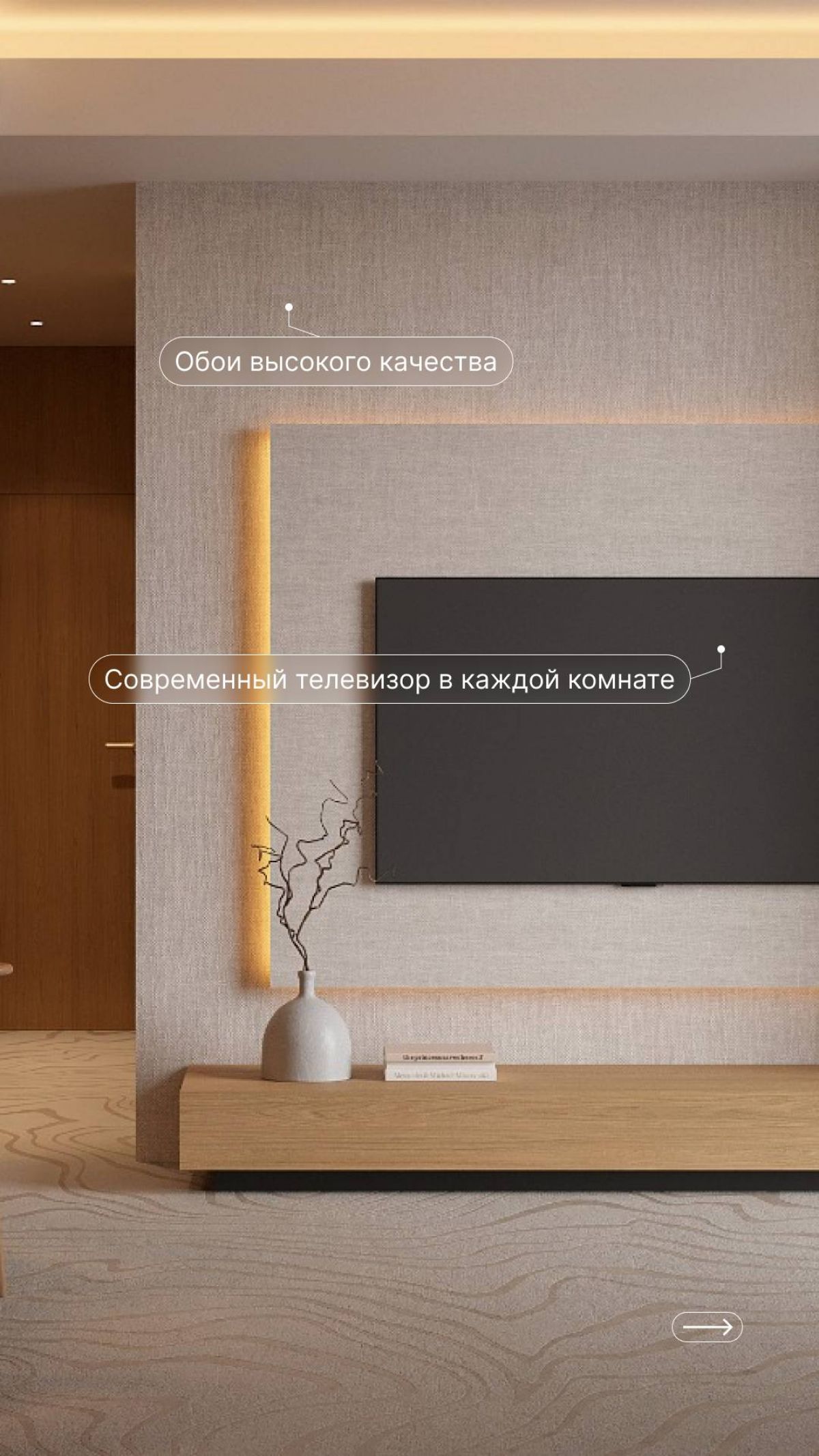 Дизайнерский ремонт: каждый номер передаётся с готовым стильным интерьером, современной техникой и текстилем.