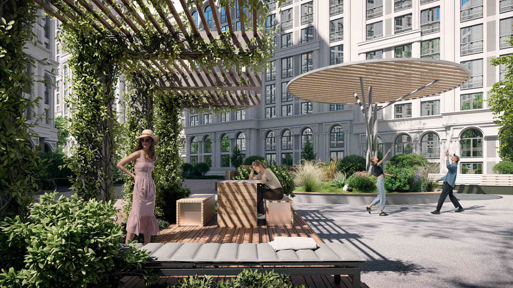 Придомовая территория закрыта для доступа посторонних. На въездах во двор установлены шлагбаумы с технологией распознавания госномеров. На дверях подъездов вмонтированы «умные» домофоны, которыми можно управлять с мобильных устройств собственников, когда видеозвонок приходит прямо в специальное приложение.