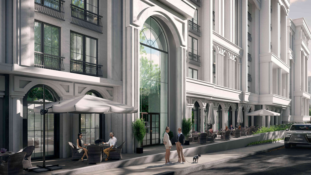 При проектировании ЖК был учтён принцип «город в городе». На первых этажах корпусов предусмотрены все необходимые для повседневных нужд коммерческие помещения (магазины, аптеки, пункты выдачи заказов, кафе, пекарни, салоны бытовых услуг и т.п.).