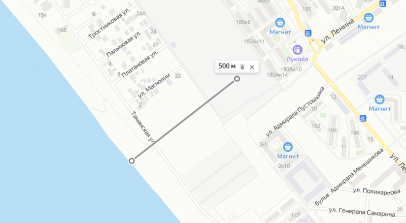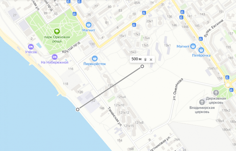 На первом мы видим район Ореховой рощи, жилой комплекс "Бельведер" и 500-метровая отметка находится как раз рядом с одним из немногих анапских долгостроев. Напомню, что долгострои эти выкупила строительная компания "Ава Групп" с прицелом реконструкции этих домов и строительства ещё двух таких же ближе к берегу. Своим решением депутаты перечеркнули им такую возможность.