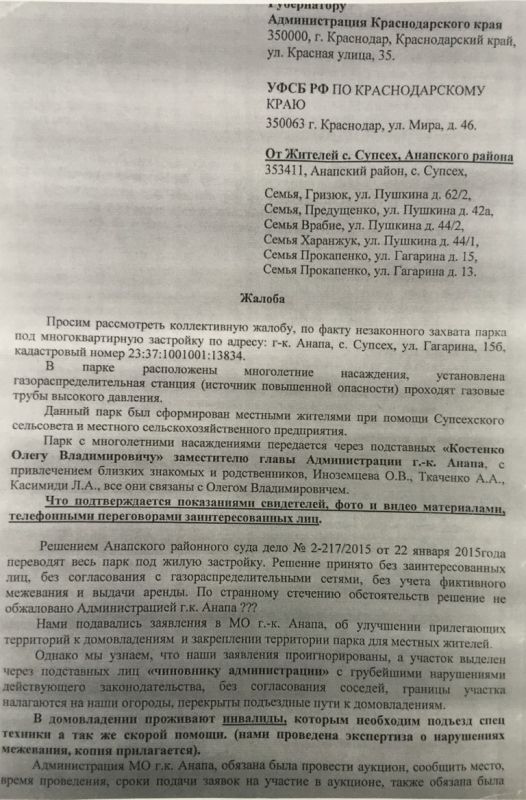 К нему и ранее были претензии по поводу присвоения земли в Супсехе в обход закона и через подставных лиц, в том числе родственников. Ещё в 2015 году в его руках чуть было не оказался земельный участок площадью почти 70 соток, часть которого занимал сельский парк с многолетними деревьями и подъездными путями, а другая часть налагалась на огороды местных жителей, проживающих по соседству. На этом месте Костенко планировал построить многоквартирные дома и торговый центр.