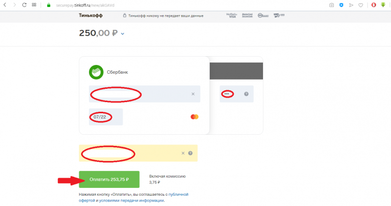 5. В специальной форме заполняем данные банковской карты и ещё раз указываем электронную почту, куда придёт выписка. Нажимаем кнопку «Оплатить».
