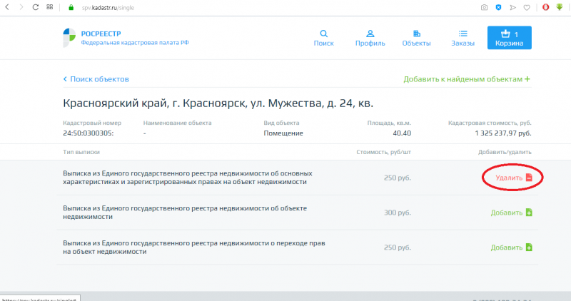 2. Из предложенного списка выбираем нужную нам выписку и нажимаем кнопку «Добавить» (после этого напротив выбранного документа появляется кнопка «Удалить»). Кстати, при необходимости можно одновременно заказать все документы из списка.